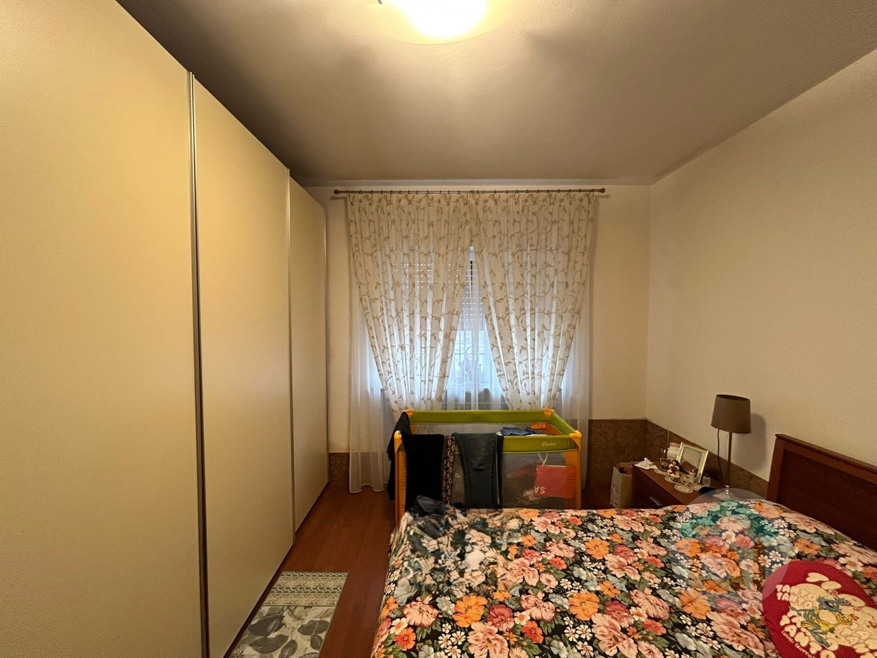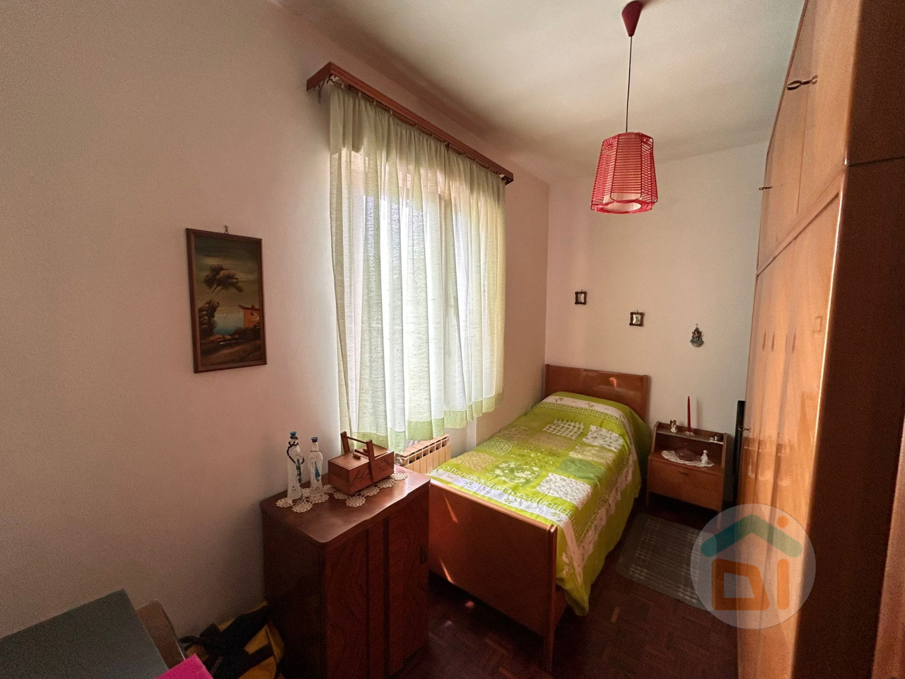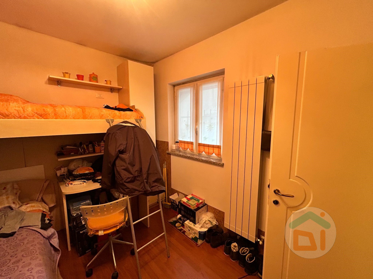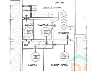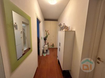 L' appartamento al piano terra é così disposto: ingresso in soggiorno con angolo cottura, disimpegno, camera singola, bagno dotato di doccia e camera matrimoniale. L'immobile é stato soggetto a una completa ristrutturazione tra il 2007 e il 2008, quindi di quell'epoca risalgono sia impianti che finiture. I serramenti sono in PVC doppi vetri, climatizzatore situato nella zona giorno, caldaia a condensazione locata in bagno. La pavimentazione si presenta in parquet nella zona giorno e nelle camere da letto, mentre il bagno é dotato di piastrelle.