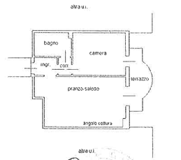 L'appartamento si trova al primo piano, è composto da ingresso, soggiorno con cucina a vista, servito da terrazzo, bagno non finestrato con doccia e completo di tutti i sanitari, una camera matrimoniale, disimpegno e due posti auto scoperti nella corte comune.