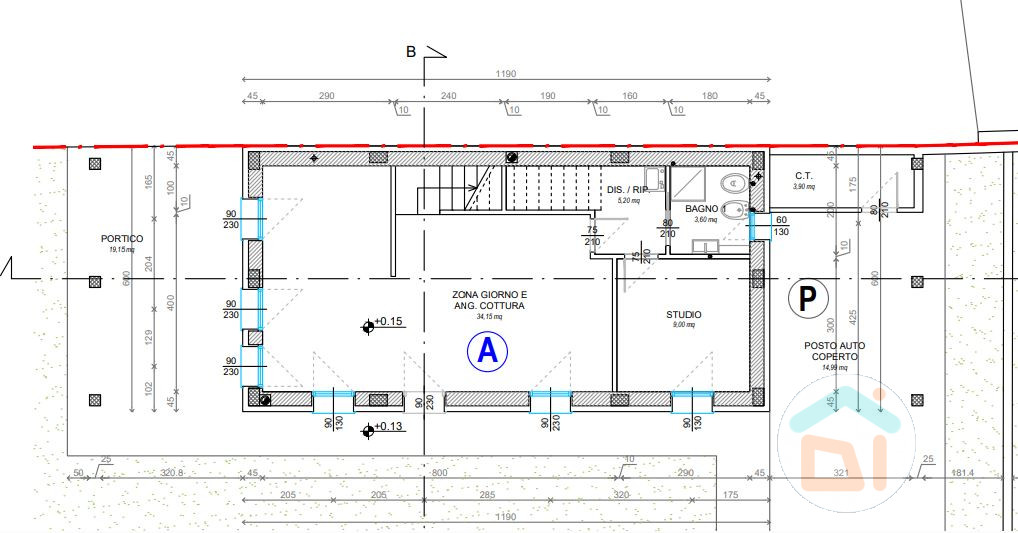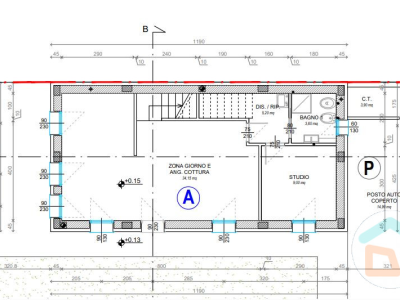 Completa un portico posto sulla facciata Ovest del lotto e una centrale termica accessibile dal secondo porticato, questo destinato al posto auto coperto, mentre il secondo sarà attribuito in corte.