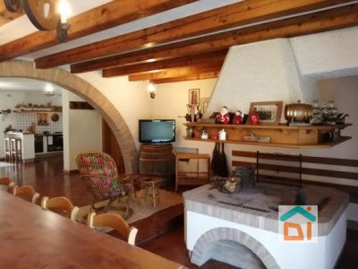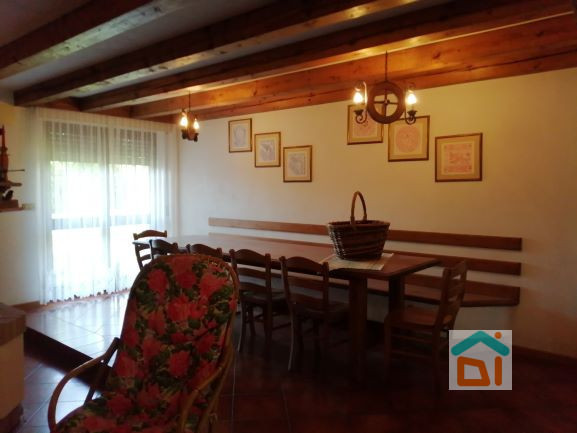 Al primo piano troviamo ampio portico di circa 60 mq, ingresso con stube, cucina con piccola stube, soggiorno con caminetto, disimpegno, tre camere e bagno con doccia. Al piano terra troviamo ampia taverna con cucina in muratura e fogolar, disimpegno con stube, due stanze ad uso ripostiglio, cantina, dispensa, bagno con vasca, lavanderia e centrale termica, portico esterno. Esternamente sono presenti dei locali accessori ad uso deposito, con tettoia e posto auto esterno. Il giardino è molto curato, piantumato. Cancello carraio automatizzato.
